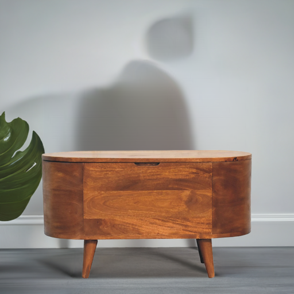 This rounded blanket box is crafted from 100% solid mango wood in a chestnut finish, it combines elegance with practicality. Store your blankets and treasures with ease, ensuring your room is always neat, tidy and organized.