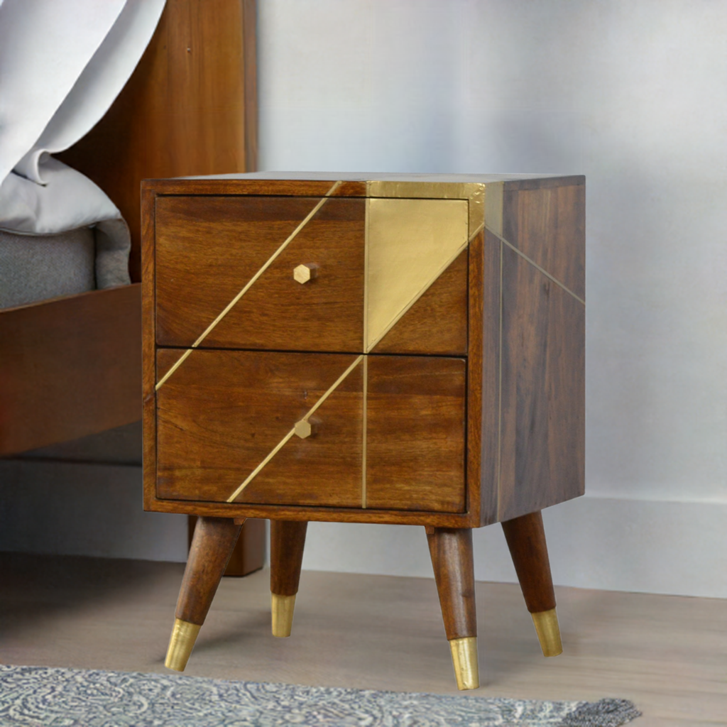 This solid timber bedside is expertly constructed from 100% solid mango wood and has a fine, smooth chestnut finish. A simple yet modern design to suit most homes, featuring carefully handcrafted joints, wooden runners, and 2 knobs. Useful storage space is available with 2 drawers which feature geometric gold brass drawer fronts, perfect for storing any small bits and keeping them close to your before bedtime, and 4 Nordic style legs that feature golden plating on the feet for extra detail.